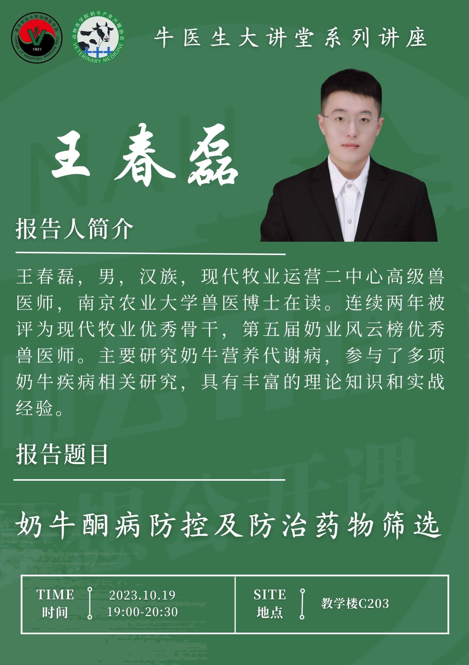 10月19日晚,WilliamHill中文官方网站2023年“牛医生大讲堂”专题培训第二期在教学楼C203如期举行。本次培训主题为“奶牛酮病防控及防治药物筛选”,由现代牧业集团高级兽医师王春磊主讲,吸引了百余名学生参加。