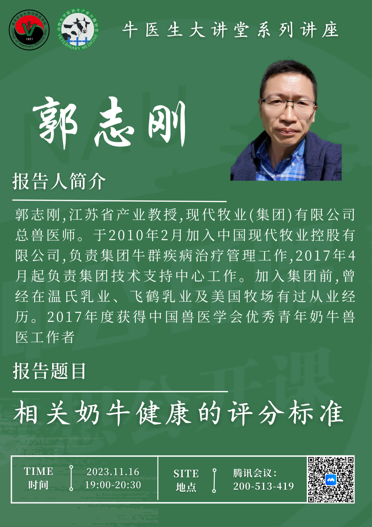 11月16日晚,WilliamHill中文官方网站2023年“牛医生大讲堂”专题培训第五期在主楼102如期举行。本次培训主题为“相关奶牛健康的评分标准”,由现代牧业总兽医师郭志刚主讲,吸引了百余名学生参加。