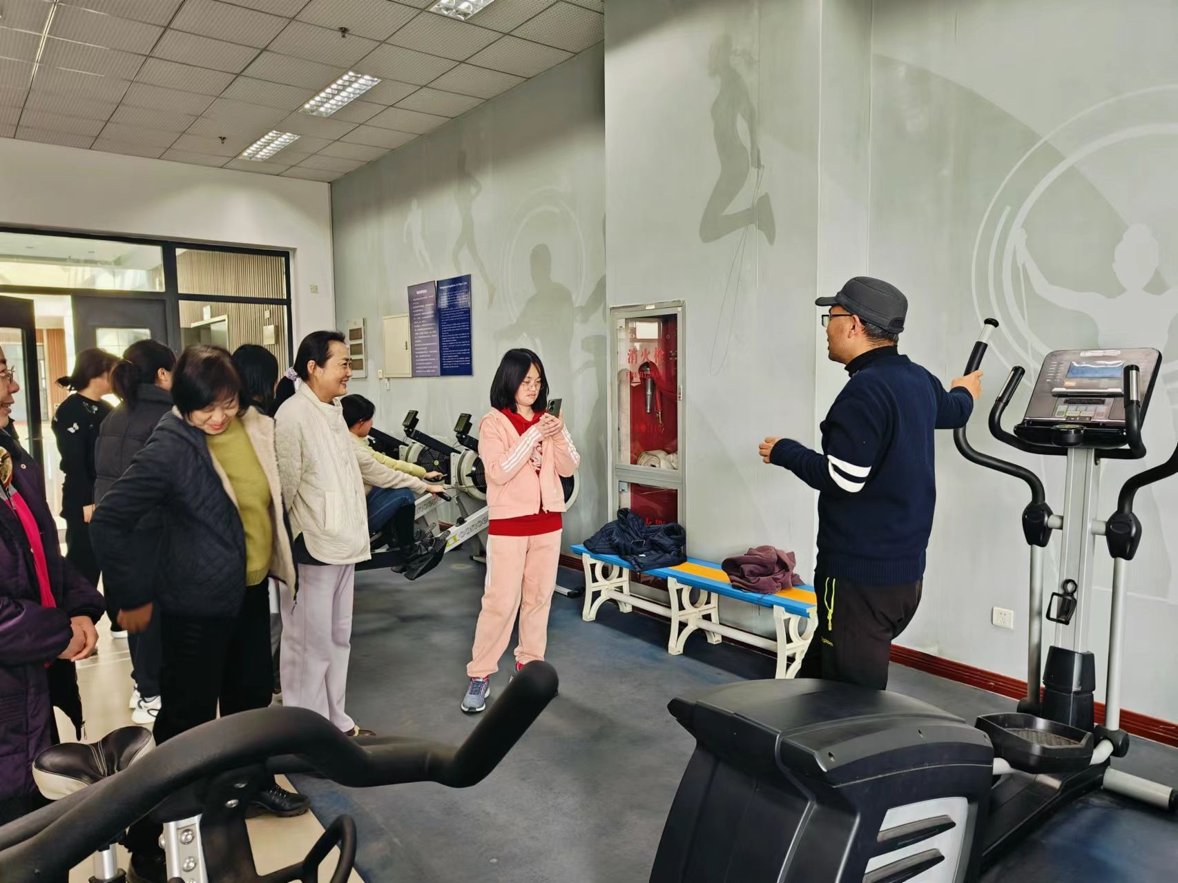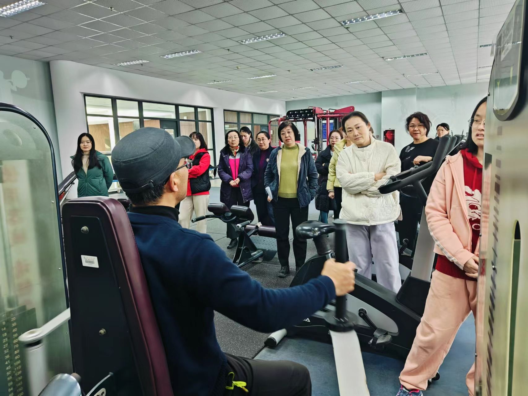 然后,周老师带领老师们来到了体育中心健身器材室,为老师们讲解了健身房器械功能、使用方法及适合您的最佳运动方式,并进行了瘦身与饮食案例分享。