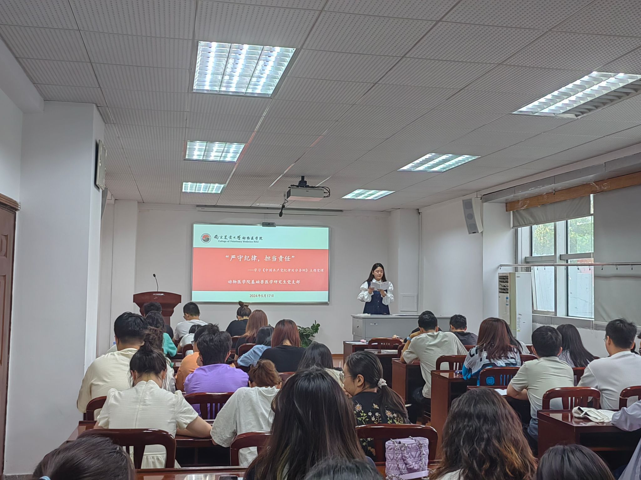 5月17日,基础兽医学研究生党支部在逸夫楼3044会议室集体学习《中国共产党纪律处分条例》。党支部书记王静以《严守纪律,担当责任》为主题,围绕《条例》主要内容、特点进行解读,引导学生党员同学坚定理想信念,自觉把遵规守纪刻印在心上,牢守政治和道德底线,增强政治自觉,强化责任担当。