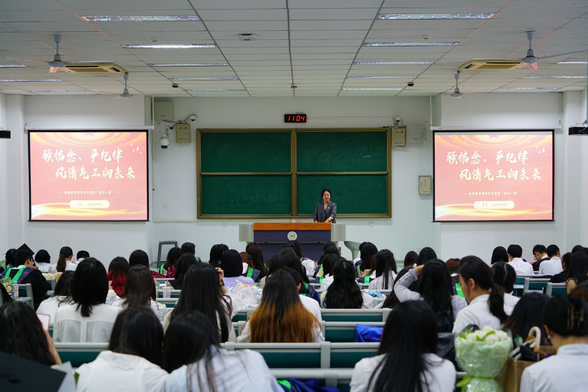 姜岩以《强信念、严纪律,风清气正向未来》为题,作党纪学习教育专题党课报告暨毕业生党员“最后一课”。报告从毕业生即将面临的变化和挑战切入,重点阐释了党纪学习教育开展的必要性和重要性,以案说纪、以案为鉴、以案明责,引导毕业生党员坚定信念,夯实信仰根基,捋清“个人与集体”的关系”;严守纪律,筑牢思想底线,捋清“利益和得失”的关系;廉洁从业,走好职业“第一步”,捋清“当下和未来”的关系”。姜岩强调,不论在各行各业,同学们都要跳出小恩、小惠、小利,守稳初心、敬畏初心、不负初心。