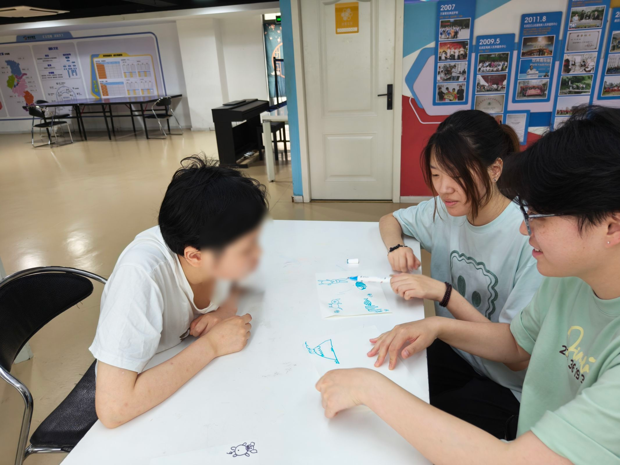 在睿泽障碍人士中心,作为一名大学生志愿者,我有幸与一群特别的朋友们共同观看了一部温馨而有教育意义的动画片——《大坏狐狸的故事》,并且向他们讲解了片中的主角——狐狸和猪的相关习性。这不仅是一次观影体验,更是一次心灵的交流和知识的传递。