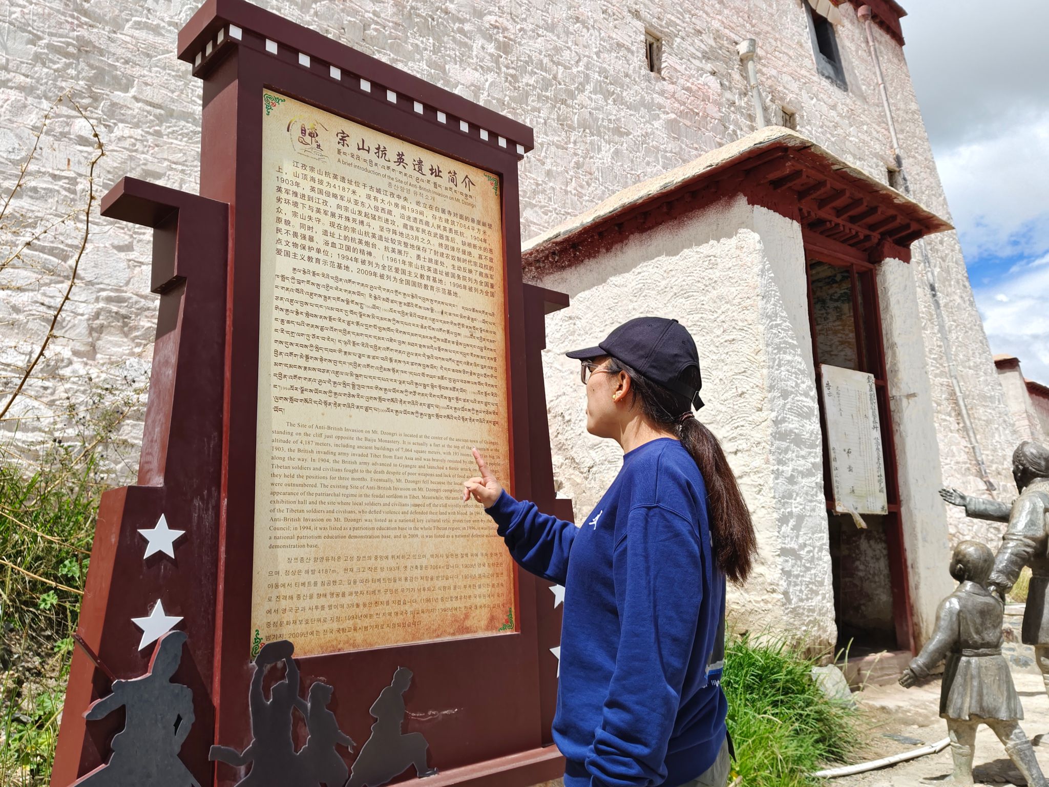 在江孜宗山抗英遗址,团队成员们参观了每一处遗迹,并通过导游的讲解以及展板描述了解到西藏人民在抗击外敌中的英勇事迹。在江孜宗山英雄纪念碑前,团队成员们肃立默哀,表达对英雄们的敬意。