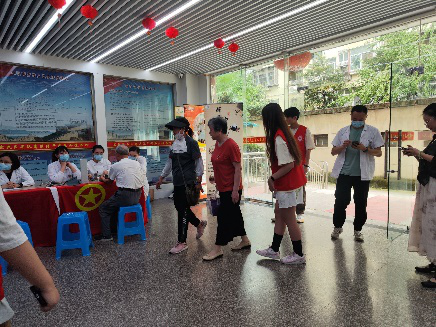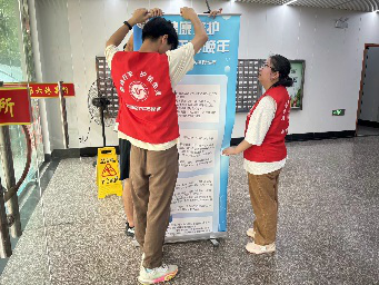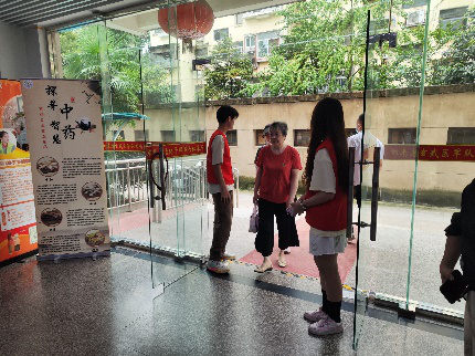 身着统一红色马甲的“微笑守护者”志愿者们,以青春洋溢的笑容和细致入微的准备,迎接着每一位踏入大厅的社区居民。成员们分工明确,有的协助社区一起完成现场的布置,有的负责引导提前到来的老人就座,有的则递上清凉的水杯,以缓解夏日的酷热。