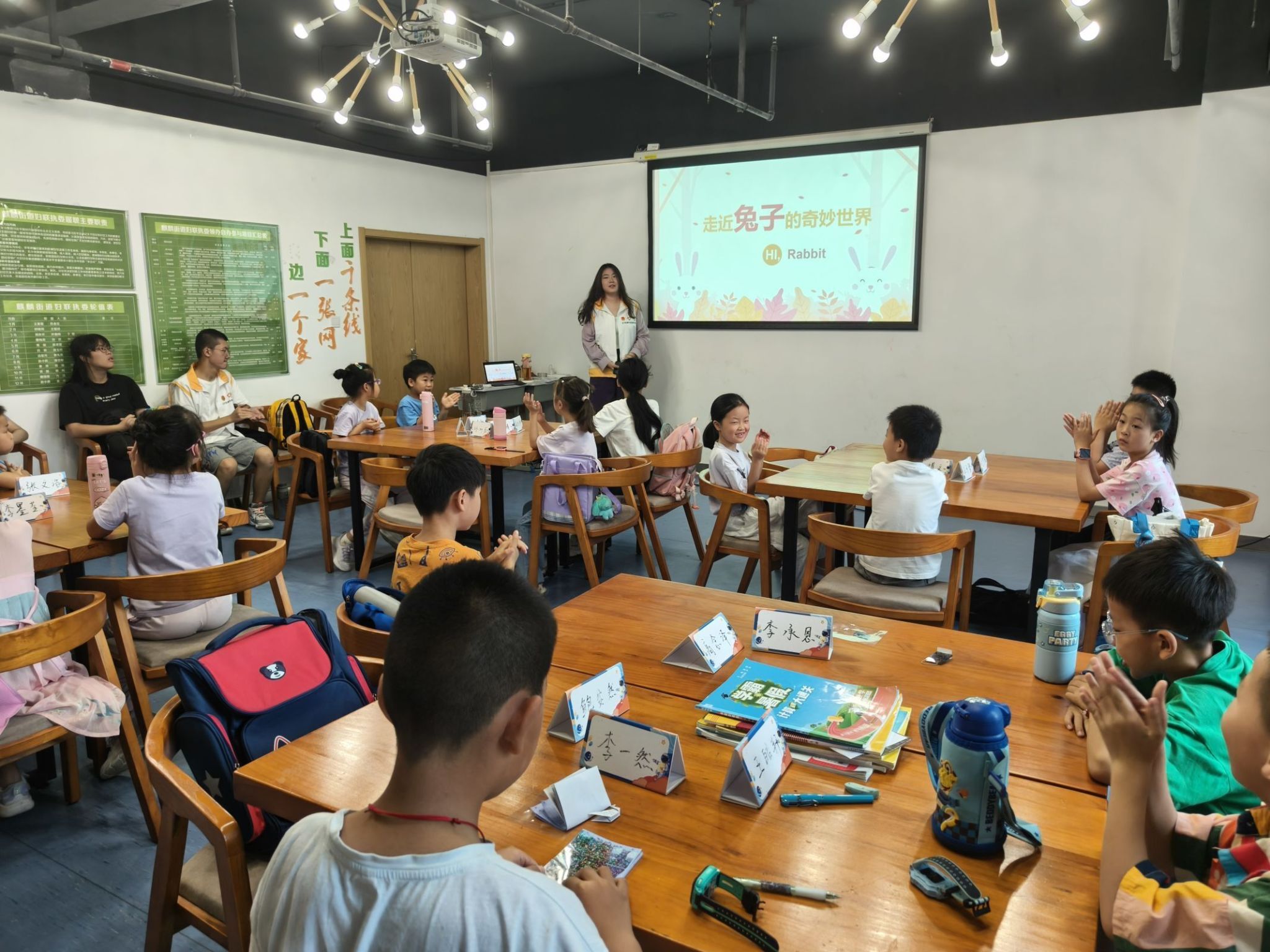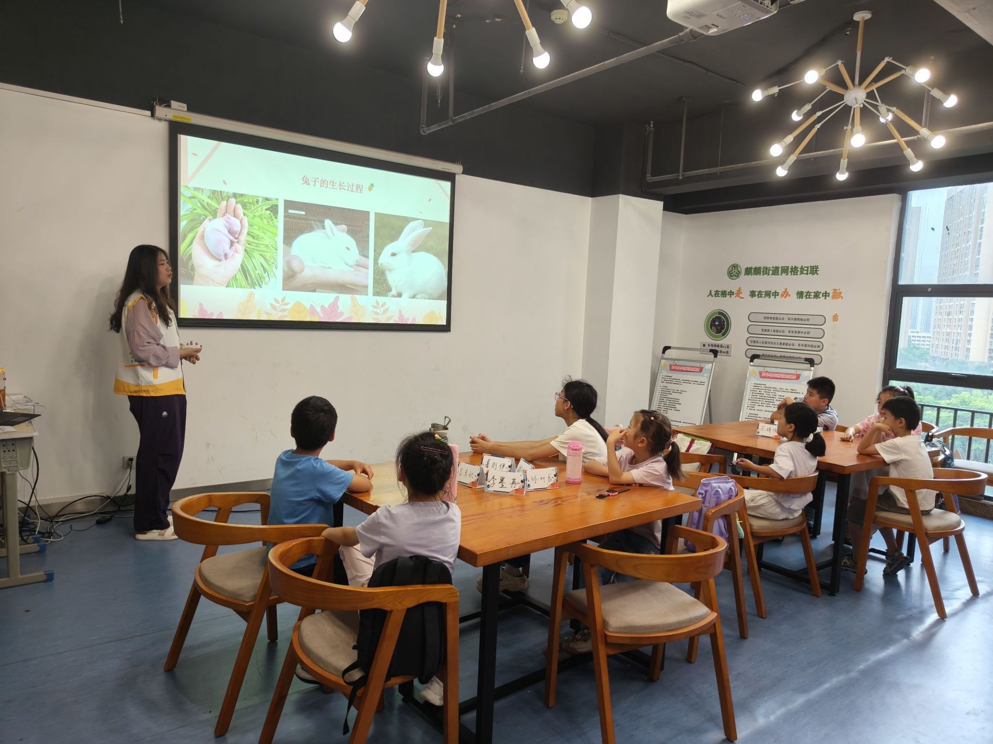 2024年7月17日,志愿者们集合前往麒麟门街道文体服务中心。在中心工作人员的帮助下志愿者们进行了课堂前的准备工作,而同学们既给予了极大的热情又保持着良好的秩序等待着课堂的开始。志愿者们借助大量生动可爱的家养兔子图片,围绕兔子的外形、生长和生活习性、兔子的应用价值三个方面展开了有趣又科学的讲解。为了让同学们更清晰深刻地了解兔子详细的运动特性,志愿者们在讲解的过程中中穿插兔子奔跑跳跃的视频,视频中不仅展示了日常生活场景中以及野外环境下兔子的运动状态,还特别呈现了慢速镜头下兔子前后肢的分解动作。通过对比的视频,向同学们生动地展示了兔子如何运用发达的四肢完成惊人的跑步和跳跃动作。