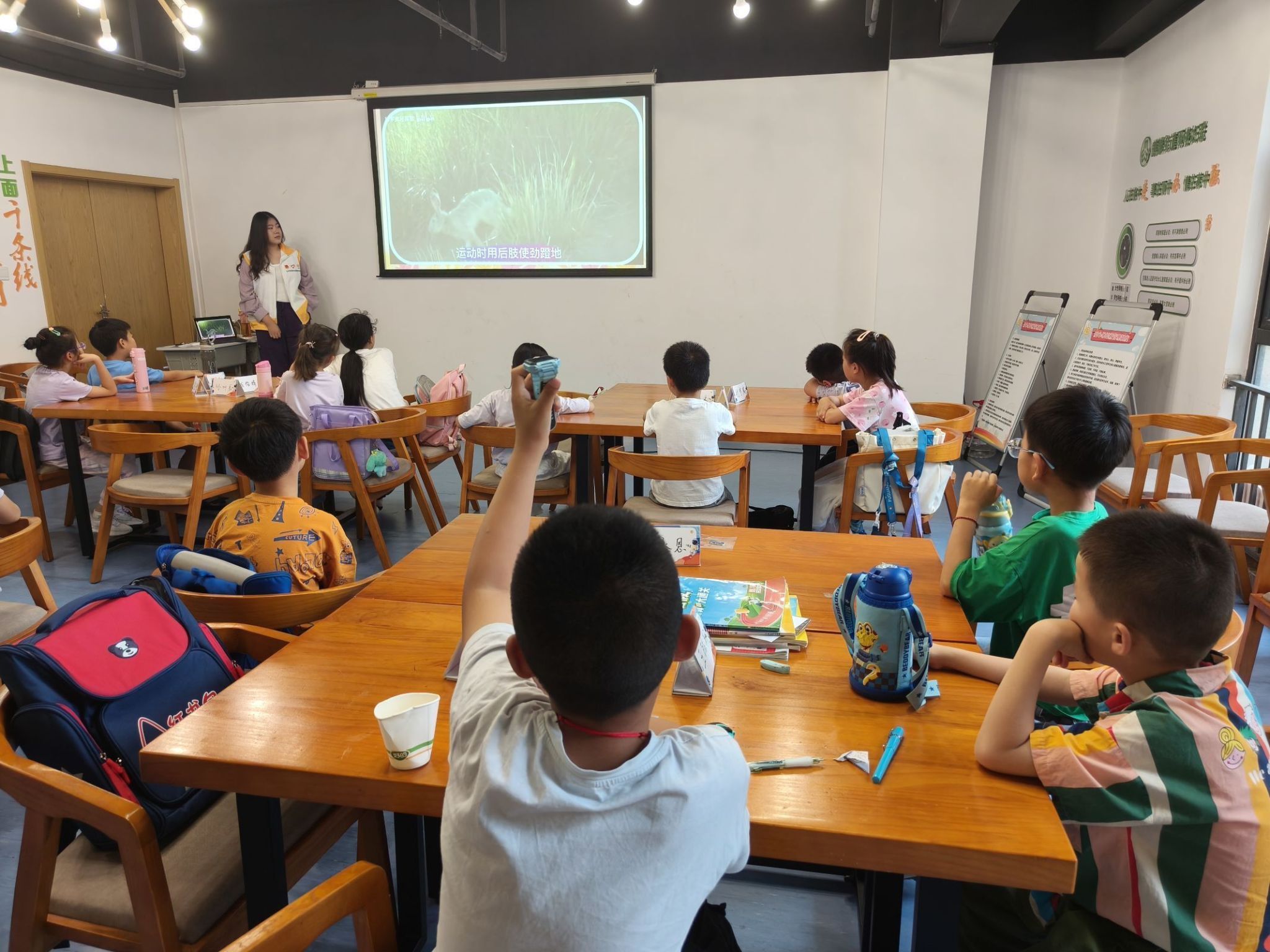 志愿者们在讲授兔子运动方式的过程中结合图像与视频的方式,向同学们解释了体型较小的食草动物如何通过精妙的身体运用完成灵活而快速的奔跑,如何依靠四肢配合跳跃难以想象的高度。同时志愿者们采用提问的形式,让同学们通过模仿兔子如何完成前肢交替行走、后肢用力蹬地的动作并复述讲解内容的方式,加深了同学们对科普内容的理解和记忆。科普兔子在医学领域的应用价值时,同学们了解到兔子和人类有相似的生殖方式,所以常被用于医学实验中,而有的同学就联想到实验中兔子与人有不同的注射部位。通过知识科普课堂,不仅激发了同学们的好奇心,也引领他们开启了自发探索动物世界的脚步。