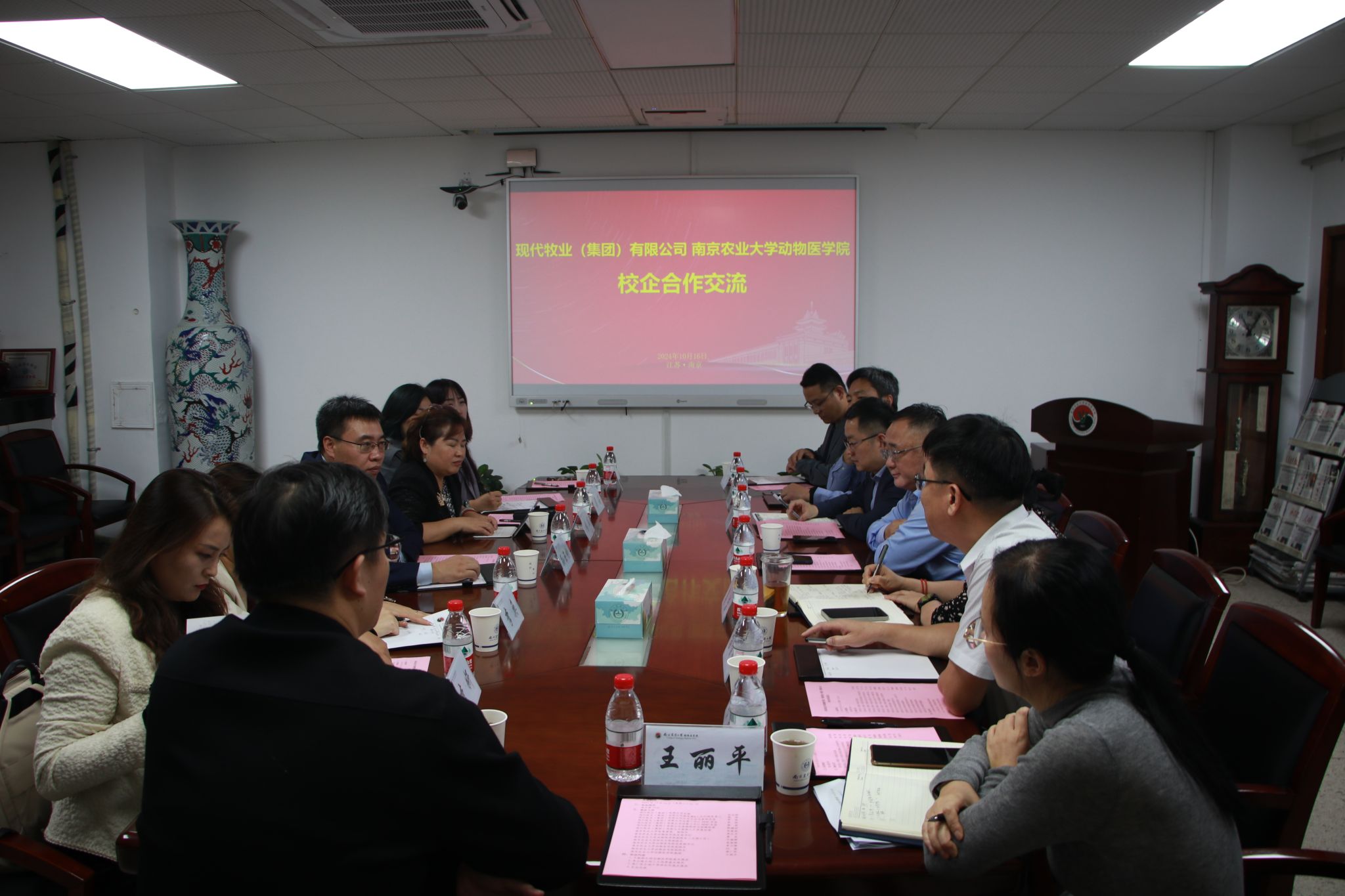 为进一步拓展校企合作领域,深化产教融合和协同育人成效,10月16日下午,现代牧业(集团)有限公司总裁孙玉刚一行来到WilliamHill官网开展校企合作洽谈会。william威廉中文官网党委常委、副校长单正丰出席座谈交流,现代牧业集团副总裁、人力行政负责人袁丽,企业文化与宣传总监李奂、运营二中心HRBP总监李妍、运营三中心HRBP总监梁茹、高级组织与招聘经理郝婧妤、高级人才发展经理孙家亮,WilliamHill中文官方网站党委书记姜岩、副院长(主持工作)平继辉、研究生院副院长苗晋锋,WilliamHill中文官方网站党委副书记李云锋、副院长刘斐、副院长常广军以及王丽平教授等参加会议。会议由姜岩主持。