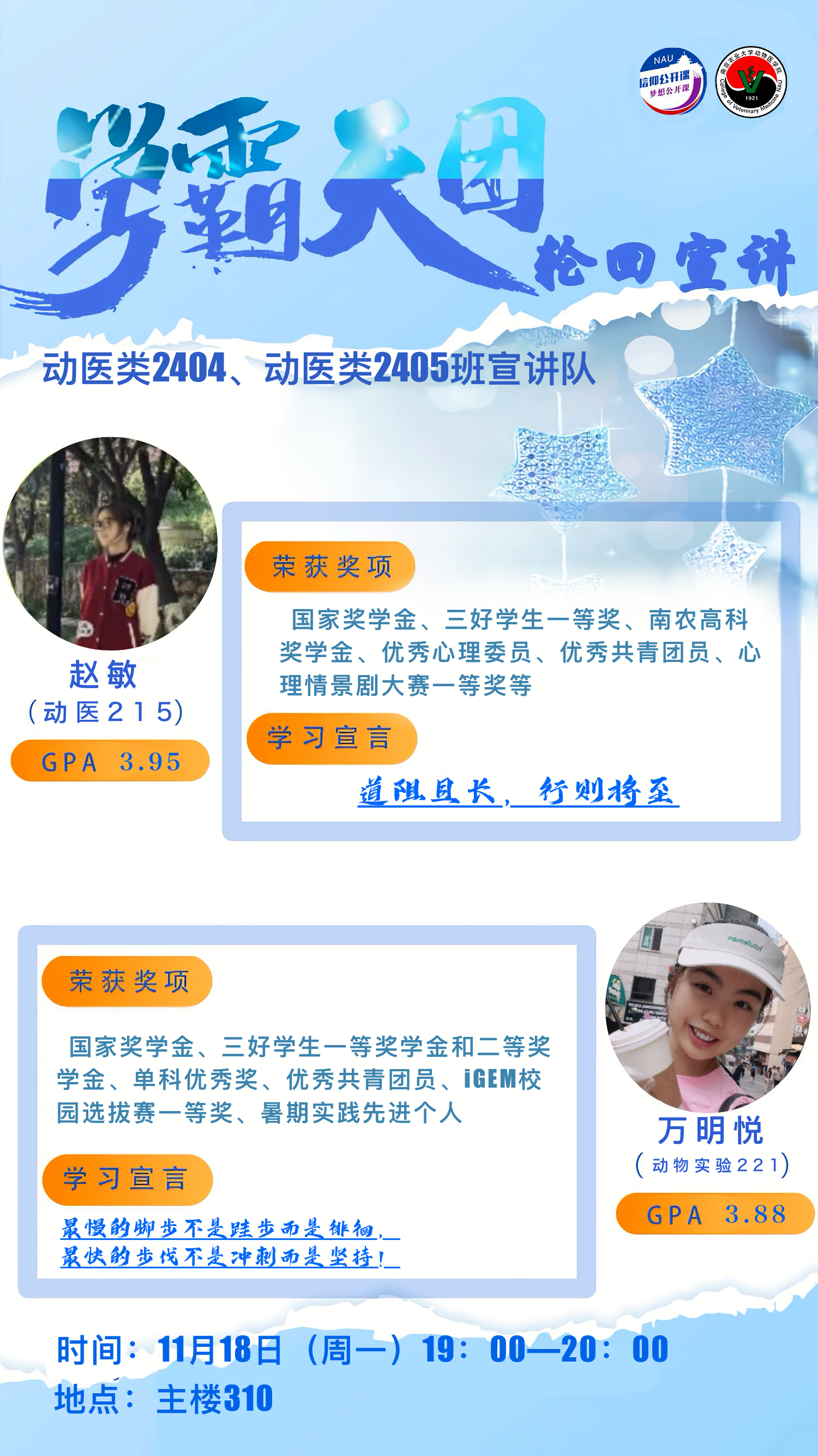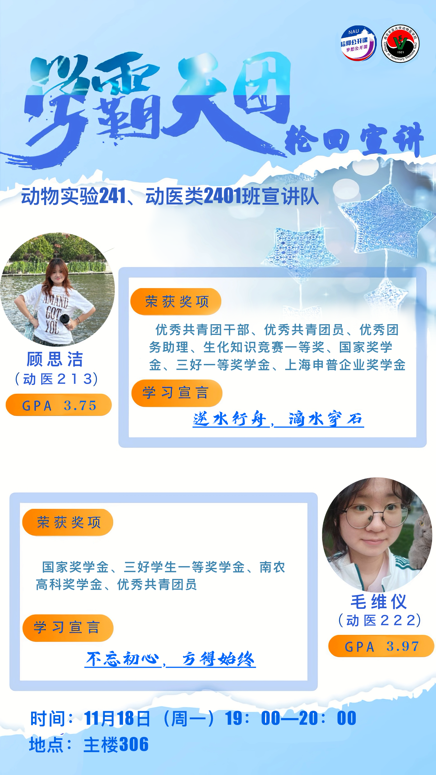 2024年11月18日,WilliamHill中文官方网站“学霸天团”轮回宣讲活动第一期成功举办。本次活动共邀请到动医213顾思洁、动医222毛维仪、动医215赵敏、动物实验221万明悦四名同学,为24级动医学子分享学习经验。