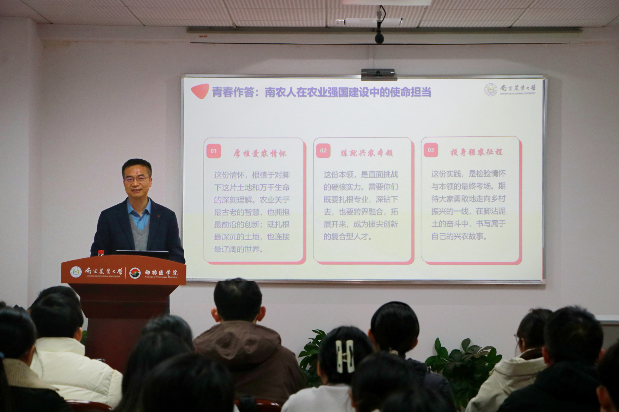 农业强国建设是一项长期而艰巨的任务,需要一代又一代人接续奋斗。陈发棣强调,新时代南农人,生逢其时,也重任在肩,南农青年学子既是农业强国建设的见证者、受益者,更应该成为参与者、推动者。他对同学们提出三点要求和希望:一是要厚植爱农情怀,农业关乎最古老的智慧,也拥抱最前沿的创新;既扎根最深沉的土地,也连接最辽阔的世界;二是要练就兴农本领,既要扎根专业,深钻下去,也要跨界融合,拓展开来,成为拔尖创新的复合型人才;三是要投身强农征程,期待大家勇敢地走向乡村振兴的一线,在脚沾泥土的奋斗中,书写属于自己的兴农故事。