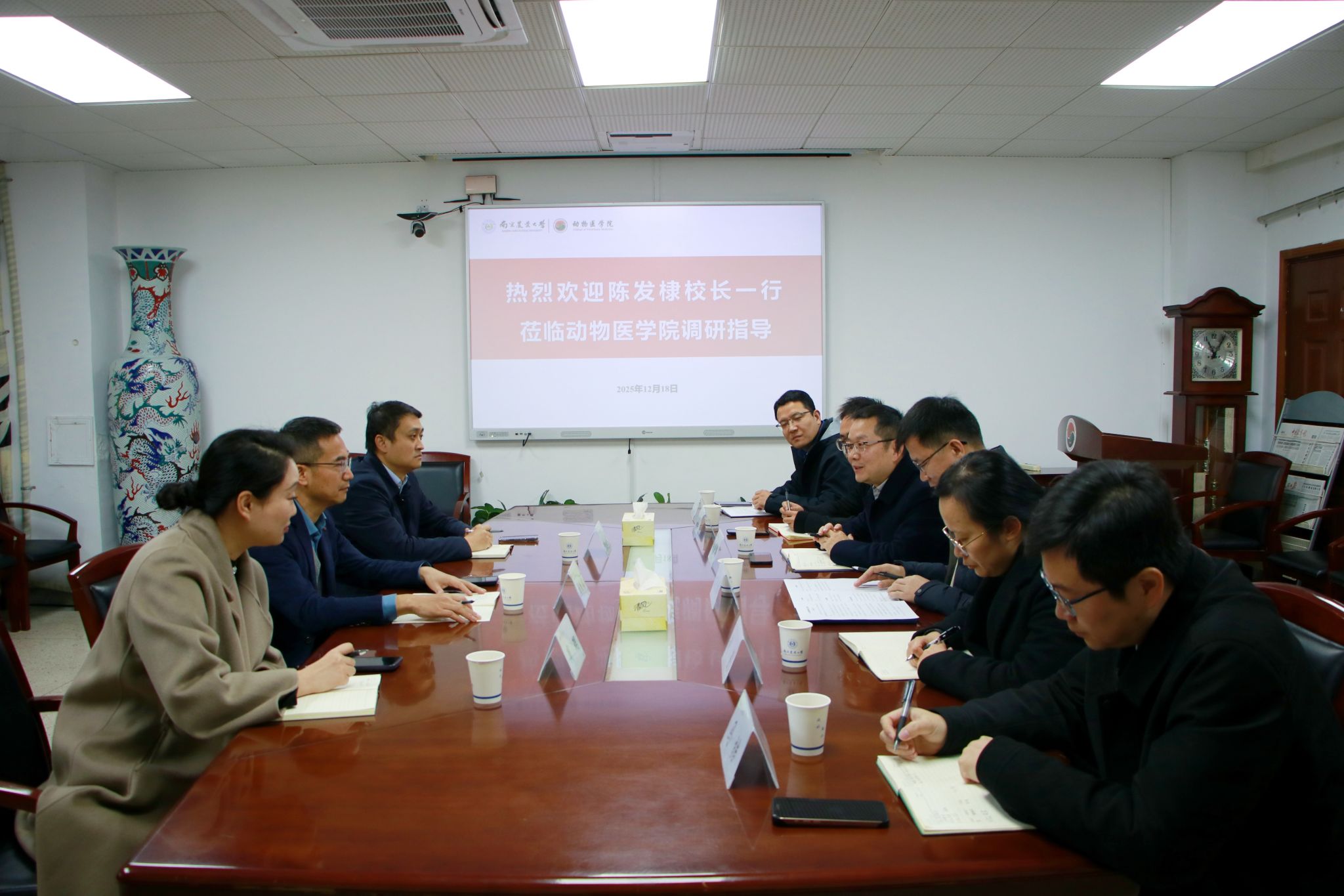 形势与政策课后,陈发棣来到学院,与院领导班子座谈调研,听取了学院在学科建设、人才培养、科研进展等方面的工作汇报,并就学院高质量发展问题进行交流指导。