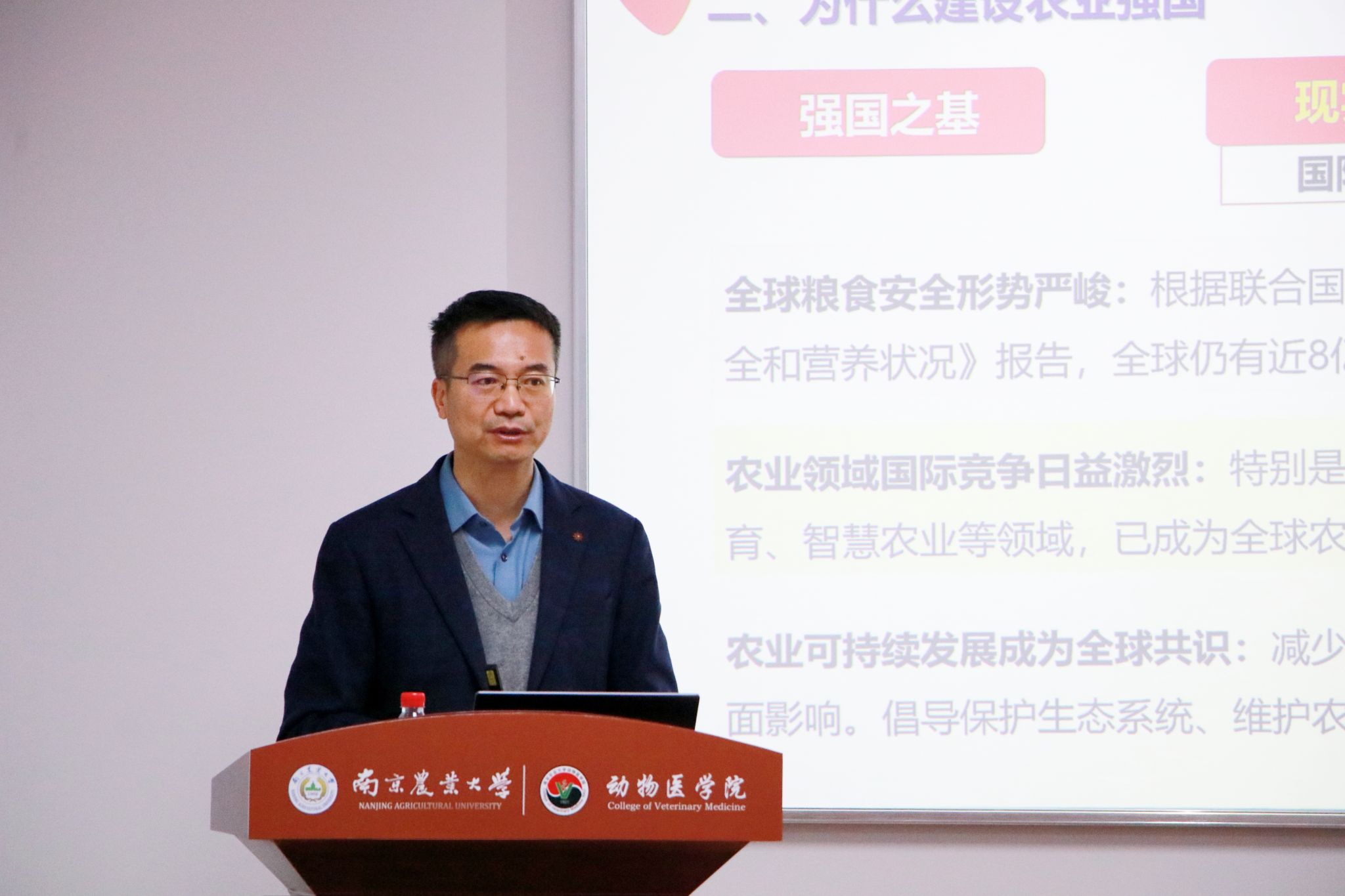 从什么是农业强国、为什么建设农业强国、怎么建设农业强国三个方面,陈发棣系统介绍了我国农业农村现代化建设的现状,并通过多个实际案例,详细介绍了南农在服务国家粮食安全战略、服务生态文明建设、服务大食物观与健康中国战略等方面做出的重要贡献,强调了建设农业强国是实现高质量发展的基础支撑,是满足人民美好生活需要的根本途径,也是推进民族复兴的关键举措,更是展现大国担当,彰显世界贡献的重要体现。