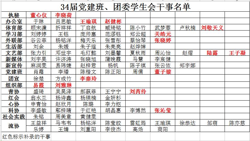 因学院学生组织换届时间调整,现根据各部门实际情况,调整团委学生会干事名单,调整原则为:干事在大一学年累计挂科不得超过3门,累计GPA不得低于2.0,此次干事任期为一个学期,在此期间被评为“优秀干事”,可加综测0.1。如有人员不符以上要求,请及时反馈至许秋华:13851451608处。公示时间为2017年9月28日-9月30日,最终干事名单如下: