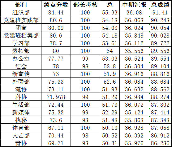 总体的考核成绩由中期汇报得分,部长考核得分和部门均绩按4:3:3比例得出。其中汇报得分按辅导员平均分、主席团平均分和部门互评平均分按4:3:3比例得出。