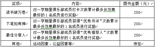 俱乐部部长每学期可以获得200元的图书购买额度;各小组组长每学期可以获得100元的图书购买额度;所有报名参加俱乐部的成员,就可以获得30元的图书奖励额度;完成第一阶段21天打卡的成员(包括部长、组长)每人可以获得30元的图书购买额度;通过第二阶段66天打卡的成员(包括部长、组长)每人可以再获得30元的图书购买额度;通过第三阶段101天打卡的成员(包括部长、组长)每人可以再获得30元的图书购买额度。