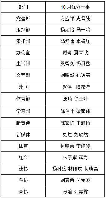 【学生工作】第36届党建班、团委学生会各部门10月优秀干事名单公示