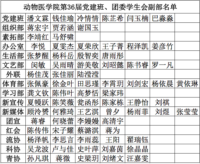 根据第36届党建班、团委、学生会各部门的实际情况,以及调整原则,最终拟录入副部名单如下,考核期为2019年12月19日-2020年4月20日: