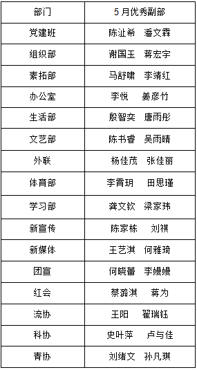 【学生工作】第36届党建班、团委学生会各部门5月优秀副部名单公示