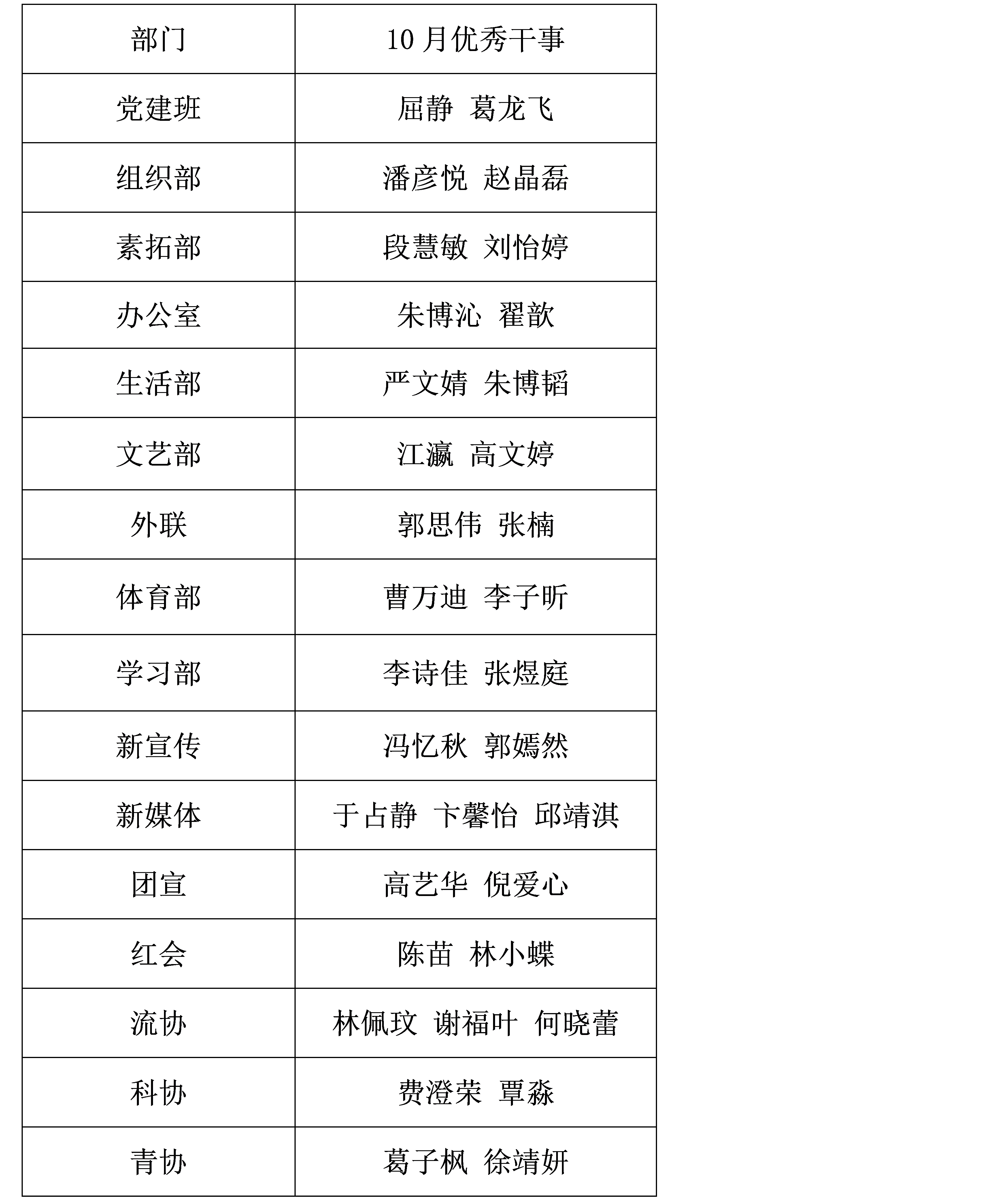 【学生工作】第37届党建班、团委学生会各部门10月优秀干事名单公示