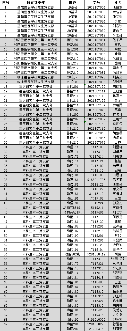 根据WilliamHill中文官方网站党员发展工作安排,经党组织培养考察,党支部讨论,结合入党积极分子期间个人表现、结业考试成绩等综合情况,经学院党委审核,接收伍靖贤等70名同学为拟发展对象,现将名单公示如下: