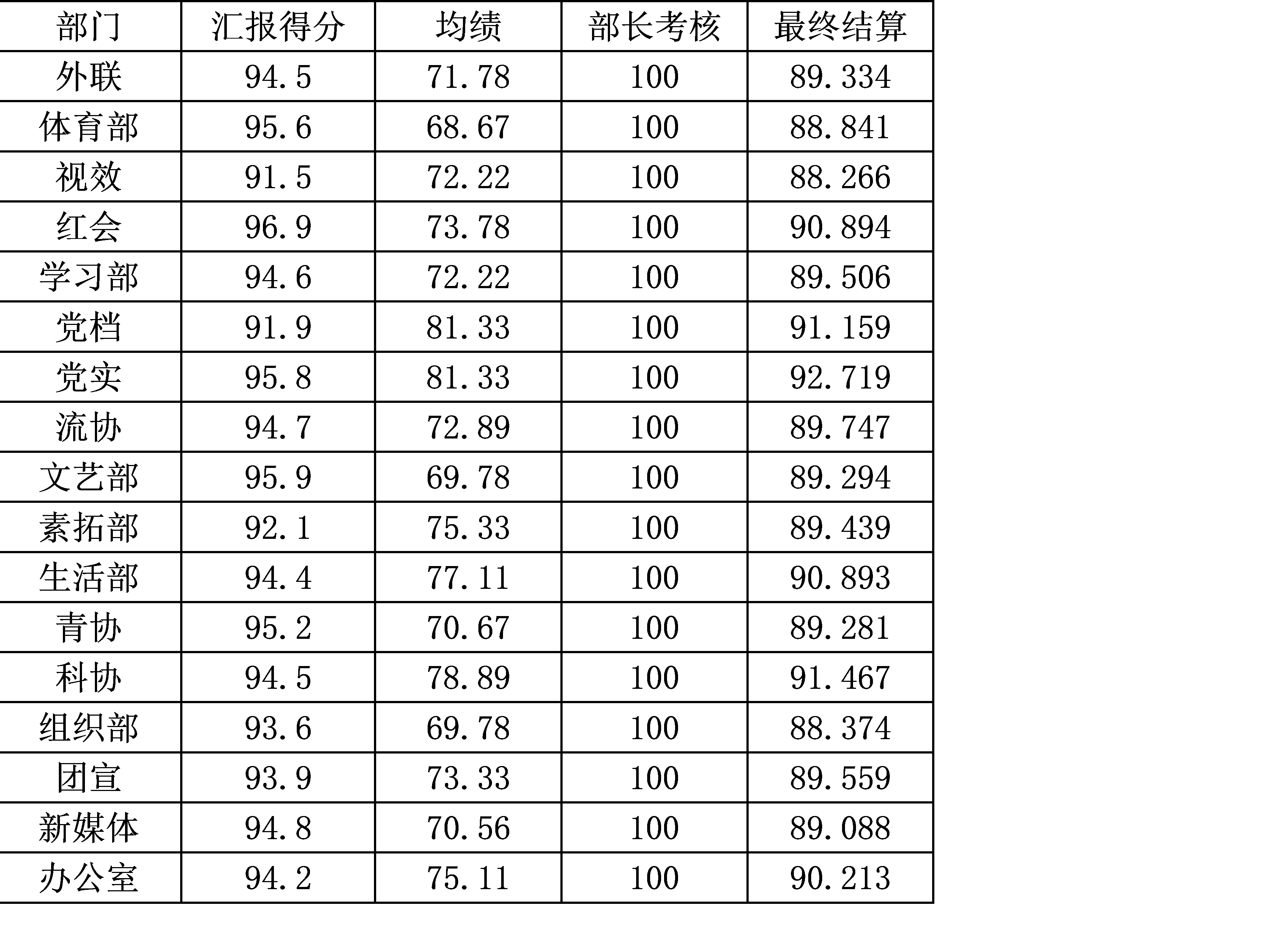 根据WilliamHill官网党建班、团委、学生会部门考核方法,各部门经部门考核、部长答辩、成绩折算等考核方式进行打分,得分经过统计汇总,现将考核结果以以公示,公示期为2021年12月22日至2021年12月24日,如有异议,请于2021年12月24日18:00前反馈到办公室处。