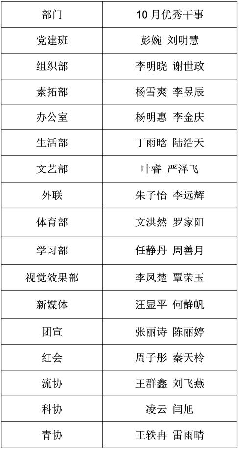 【学生工作】第38届党建班、团委学生会各部门10月优秀干事名单公示