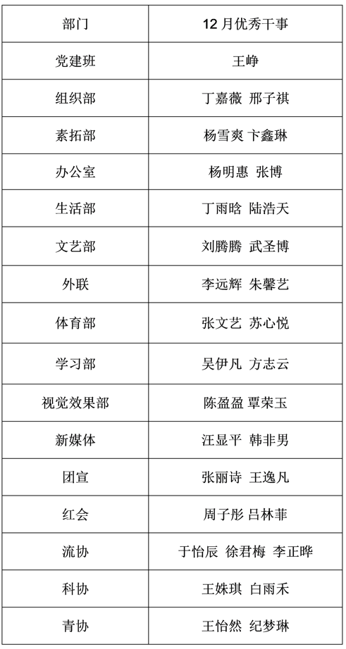 【学生工作】第38届党建班、团委学生会各部门12月优秀干事名单公示