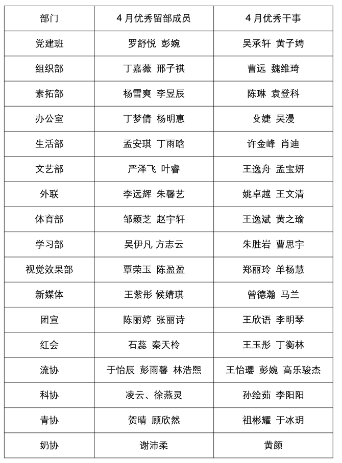 【学生工作】第38届党建班、团委学生会各部门4月优秀副部、干事名单公示