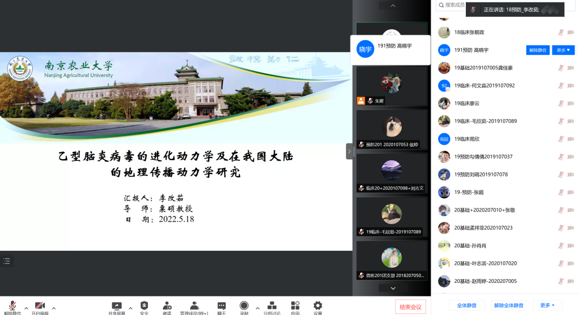 第一位汇报的是来自预防兽医学的李改茹,她汇报的题目是《乙型脑炎病毒的进化动力学和地理传播动力学研究》。目前从进化动力学角度解析JEV的流行动态依旧缺乏,理解JEV在我国的时空动态传播过程有利于JEV的有效防控;并且传统的流行病学数据与数学模型以及生念字数据相结合是深入揭示人畜共患病毒,尤其是虫媒传播病毒的传播动态以及影响因素的有效工具;本研究以JEV为模型研究其地理传播过程及进化动力学,为其它蚊媒传播性疾病的研究提供了参考以及数据依据。