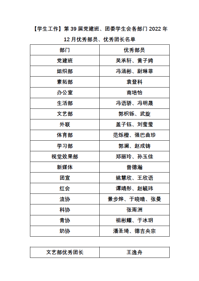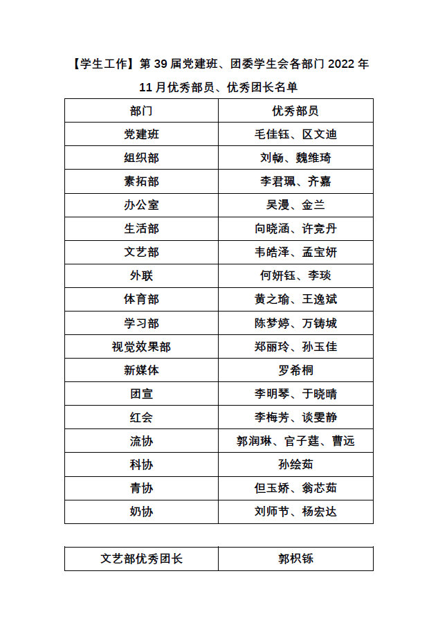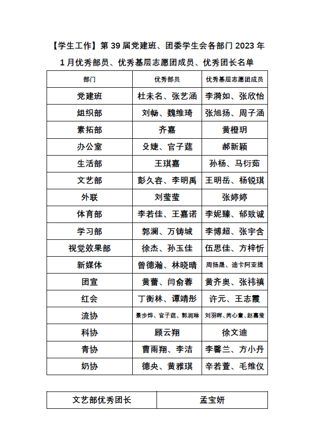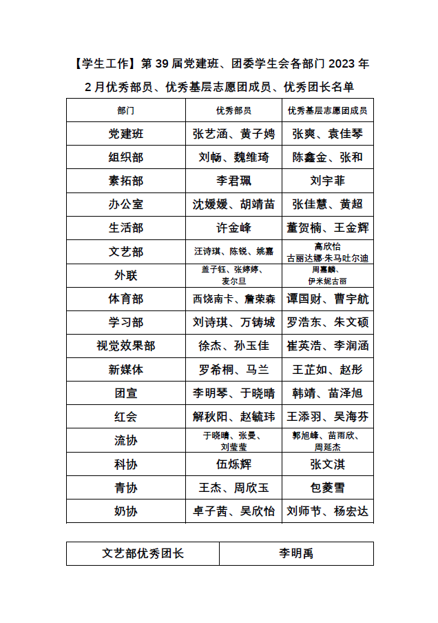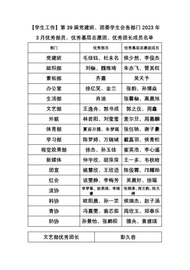 【学生工作】第39届党建班、团委学生会各部门2022年11月、12月及2023年1月、2月、3月优秀副部、优秀基层志愿团成员、优秀团长名单
