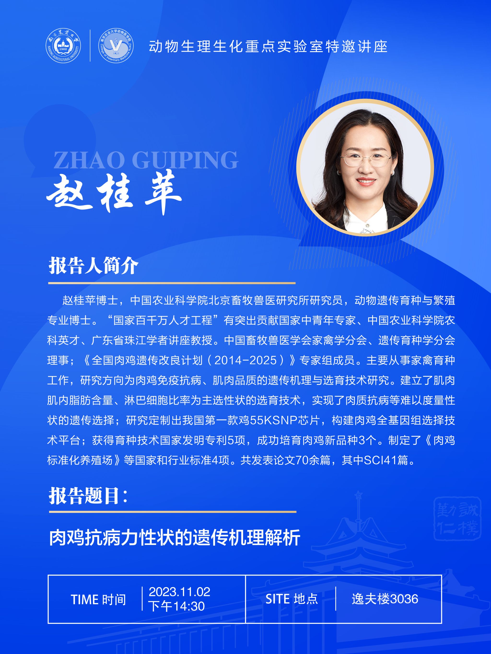 【学术报告】动物生理生化重点实验室特邀讲座:肉鸡抗病力性状的遗传机理解析