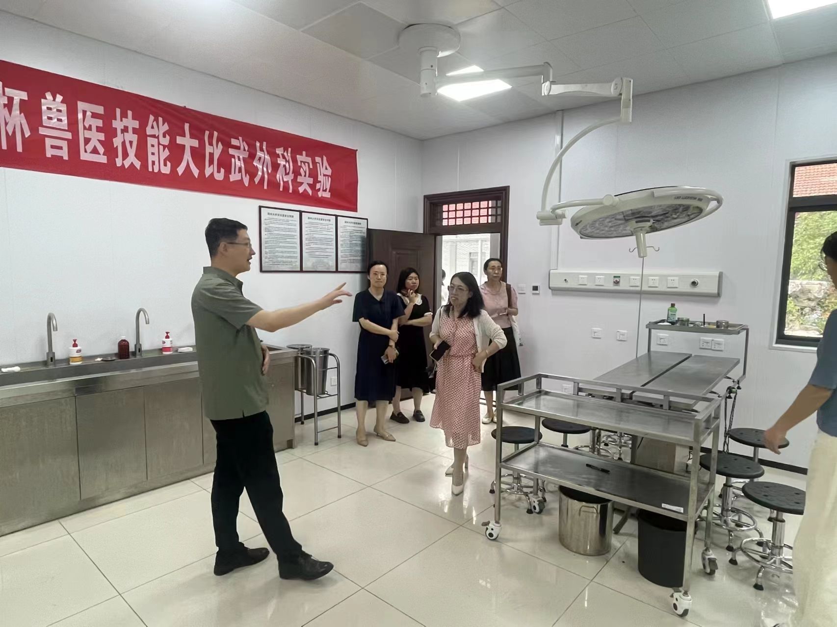在扬州大学副院长秦涛的陪同下,祖海珍一行首先参观了扬州大学国际合作联合实验室、大动物房、解剖馆、教学动物医院、方定一实验教学中心。随后,调研组进行了座谈交流。王志强对祖海珍一行的到来表示了热烈的欢迎,并从扬州大学兽医学院的历史沿革、本科人才培养、学科建设等方面,详细介绍了兽医学院的基本情况。接着,刘斐从动物医学类实验教学和教学实验室建设方面,阐述了本次调研的主要目的。双方就本科生人才培养、实验条件建设、实验技术人员队伍管理、本科教学评估等多项议题,进行了深入的交流与探讨。最后,祖海珍介绍了学校新校区启用后,校教学实验中心的建设规划,对扬州大学兽医学院在本科人才培养、教学实验中心建设方面取得的显著成效给予了高度评价,并希望后续两校、两院加强合作,共同探索和推动“新农科”人才培养模式。