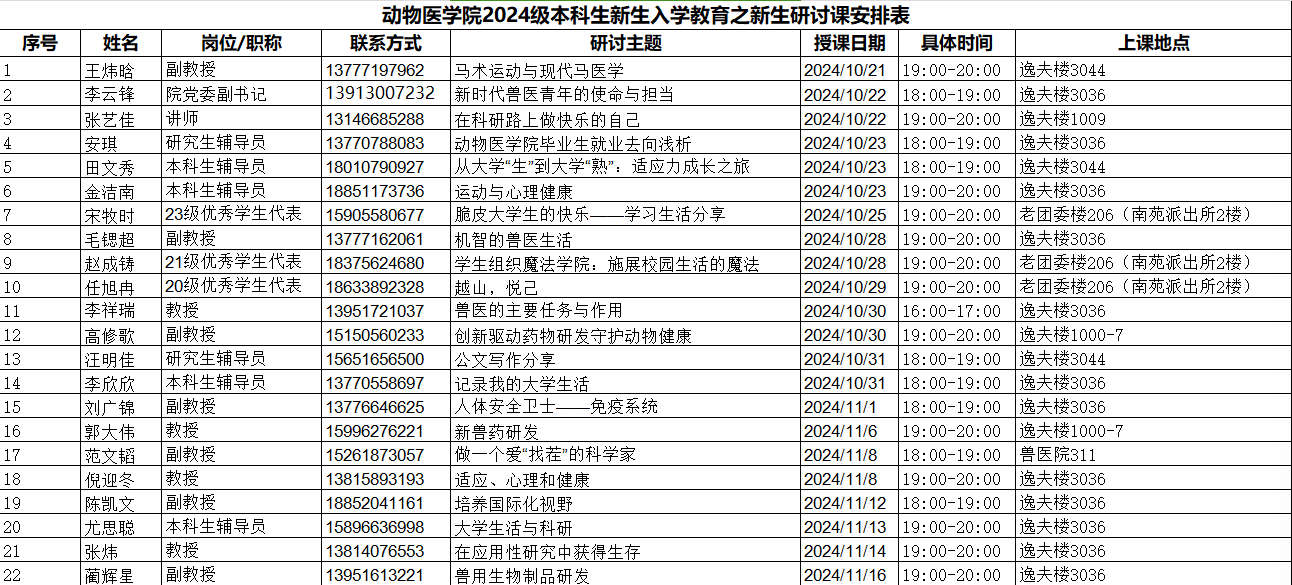 为了帮助新生顺利适应大学生活,提高自主学习能力,激发求知欲和学习兴趣,我院决定面向全体新生开设新生研讨课。此次,学院邀请了十九名授课教师及三位优秀学生代表,旨在使同学们全面、客观的认知动物医学、动物药学专业,多维度认知兽医行业发展,清晰未来规划,并启发学生的研究和探索兴趣,使同学们更好、更快适应新环境,开启丰富多彩的大学生活。