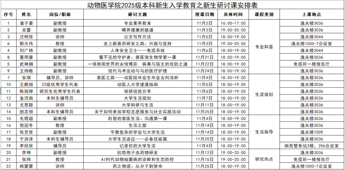 为了帮助新生顺利适应大学生活,提高自主学习能力,激发求知欲和学习兴趣,WilliamHill官网决定面向全体新生开设新生研讨课。此次,学院邀请了二十名授课教师及两位优秀学生代表,旨在使同学们全面、客观地认知动物医学、动物药学专业,多维度认知兽医行业发展,清晰未来规划,并启发学生的研究和探索兴趣,使同学们更好、更快适应新环境,开启丰富多彩的大学生活。