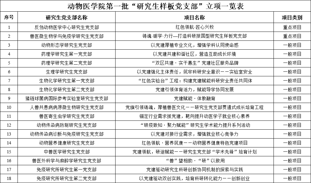 经各研究生党支部自主申报,学院党委评审,决定对反刍动物医学中心研究生党支部“红色领航·匠心兴牧”等2个项目重点立项,对人兽共患病病原微生物研究生党支部“党旗引领铸魂,厚植兽医文化——研究生党支部贯通式成长培育工程”等16个项目一般立项。现公示如下: