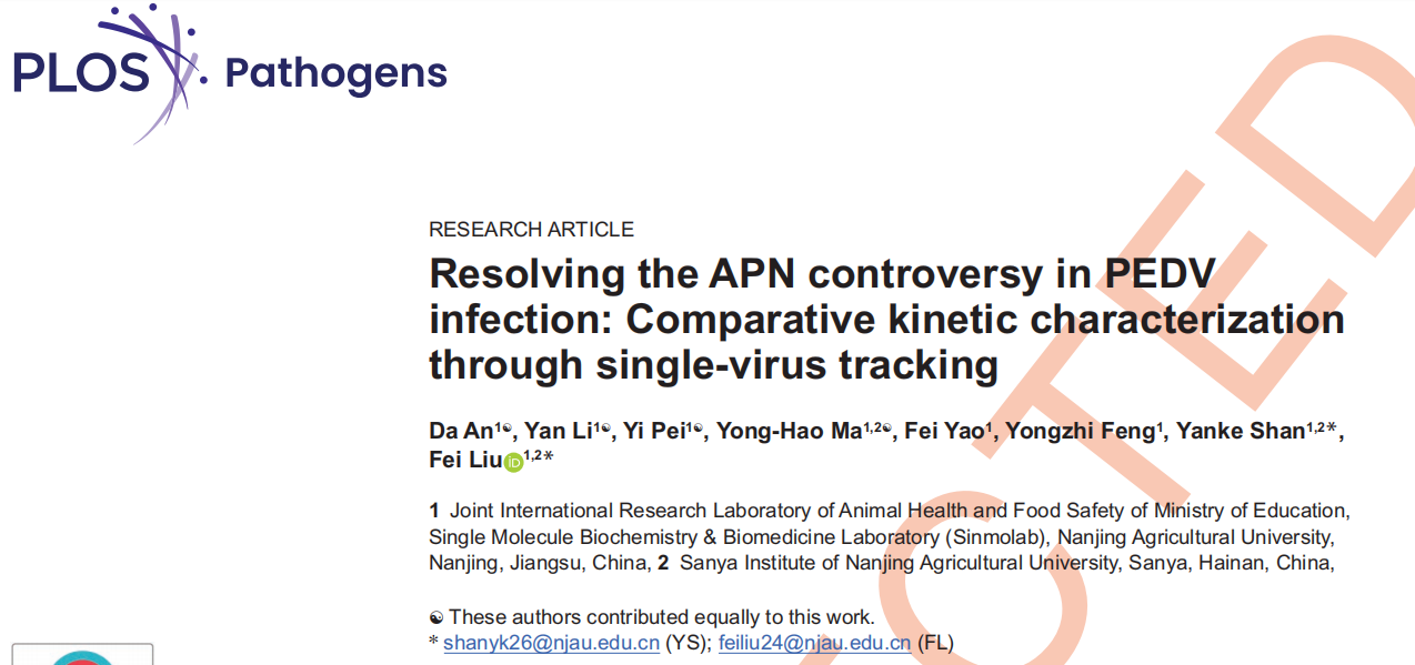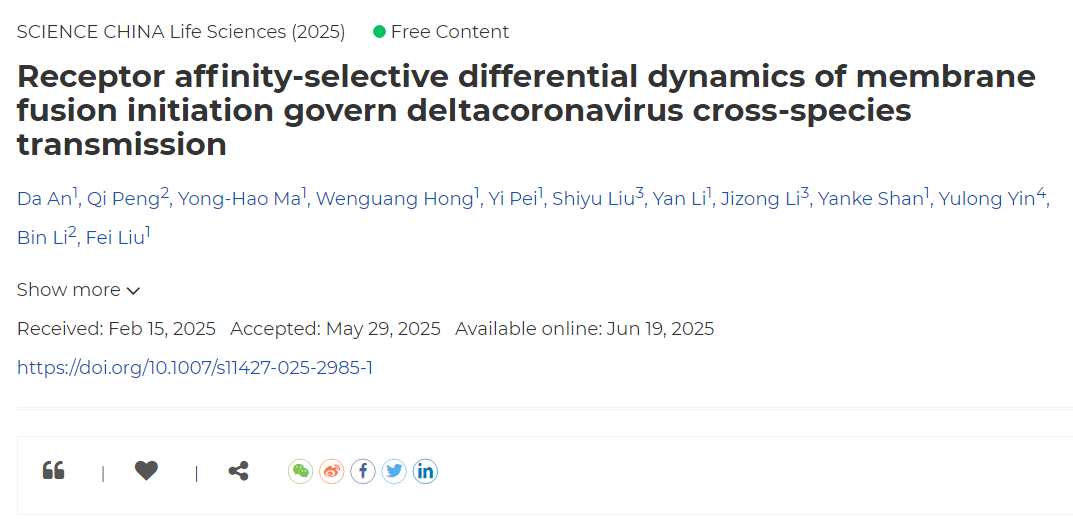 近日,WilliamHill官网刘斐教授团队在猪肠道冠状病毒(SeCoV)受体利用及跨种传播机制研究中取得重要进展。相关成果分别发表在《Science China Life Sciences》和《PLOS Pathogens》上,论文题为 “Receptor affinity-selective differential dynamics of membrane fusion initiation govern deltacoronavirus cross-species transmission”以及 “Resolving the APN controversy in PEDV infection: Comparative kinetic characterization through single-virus tracking”。