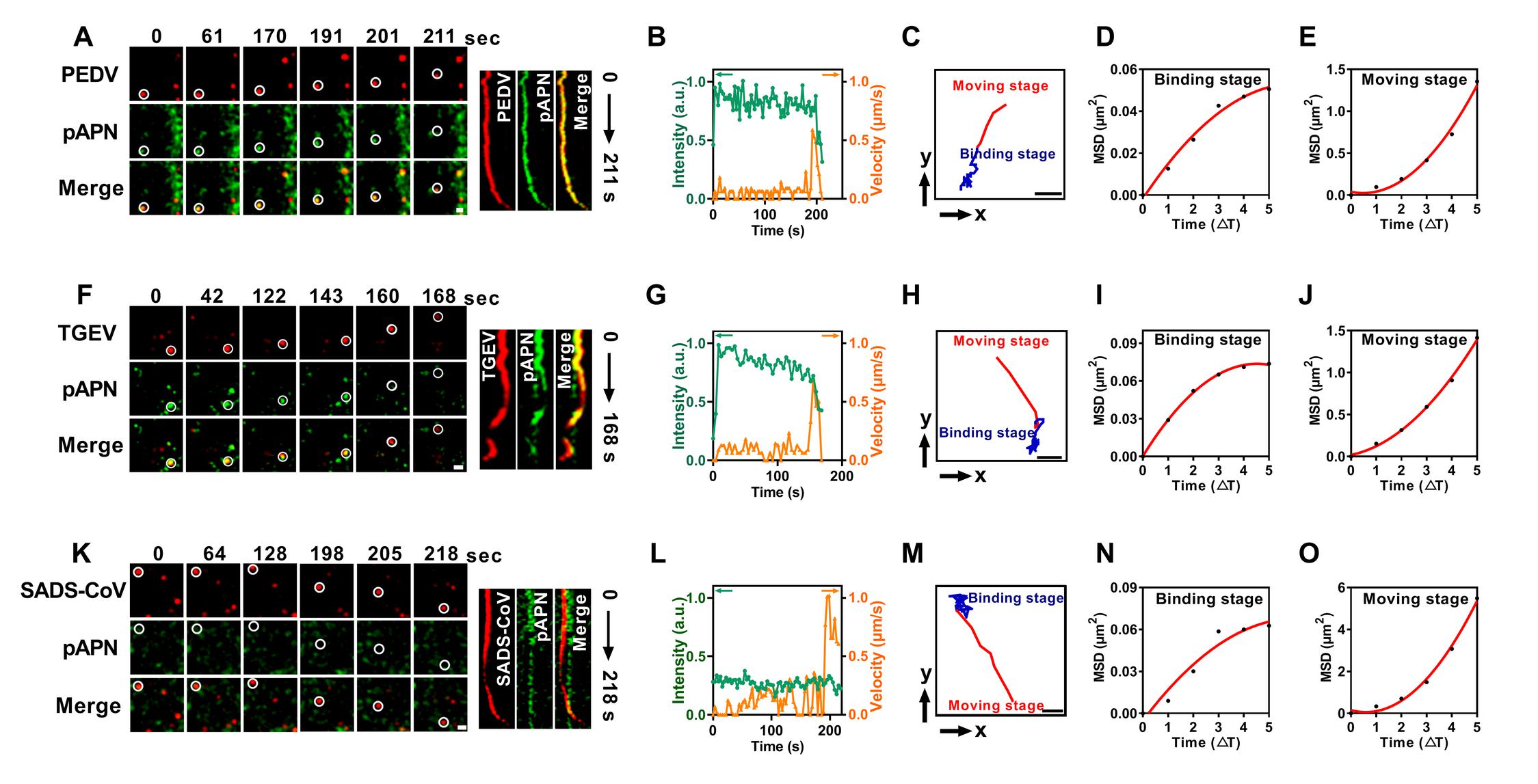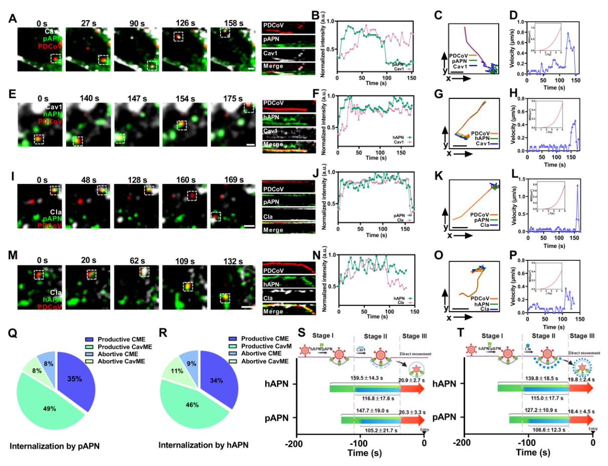 此外,为澄清PEDV在利用pAPN入侵过程中的争议,刘斐教授团队系统对比分析了PEDV、TGEV、PDCoV及SADS-CoV利用pAPN的特点。结果表明,pAPN虽可结合PEDV,但亲和力较弱,仅能在易感细胞中通过提升内化效率促进感染发生。量化分析进一步揭示,pAPN介导PEDV入侵时,其动力学过程与TGEV类似,但整体效率相对较低,这主要归因于病毒与受体结合启动阶段的差异。