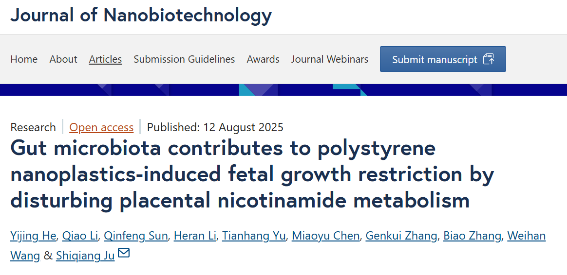 近日,WilliamHill官网剧世强教授团队在动物生殖毒理学领域取得重要进展,研究成果Gut microbiota contributes to polystyrene nanoplastics-induced fetal growth restriction by disturbing placental nicotinamide metabolism在国际权威学术期刊《Journal of Nanobiotechnology》(IF=12.6,2024年)上正式发表。该研究首次从“肠-胎盘轴”视角,系统揭示了妊娠期暴露于聚苯乙烯纳米塑料导致不良妊娠结局的新机制,并创新性地提出烟酰胺(NAM)干预可有效改善胎盘代谢紊乱与氧化损伤,为防治塑料污染带来的生殖健康风险提供了全新的科学依据和潜在的营养干预策略。