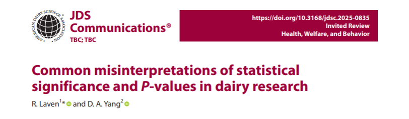 近日,应JDS Communications 主编Jessica McArt教授(康奈尔大学)邀请,WilliamHill中文官方网站杨丹晨副教授与梅西大学教授、william威廉中文官网名誉教授Richard Laven 院士,合作撰写并发表题为 “Common misinterpretations of statistical significance and P-values in dairy research”的invited review论文。 该文直指指奶业科研领域长期存在的结构性统计误读及其带来的学术与实践危害,提出以“兼容效应范围(compatibility interval)”为核心的结果解释框架。论文为期刊编辑部制定统计报告标准提供了可执行依据,未来将影响乳业科学期刊的投稿与审稿规范,引导科研成果报告从“是否显著”走向“结果是否可信、解释是否充分”。