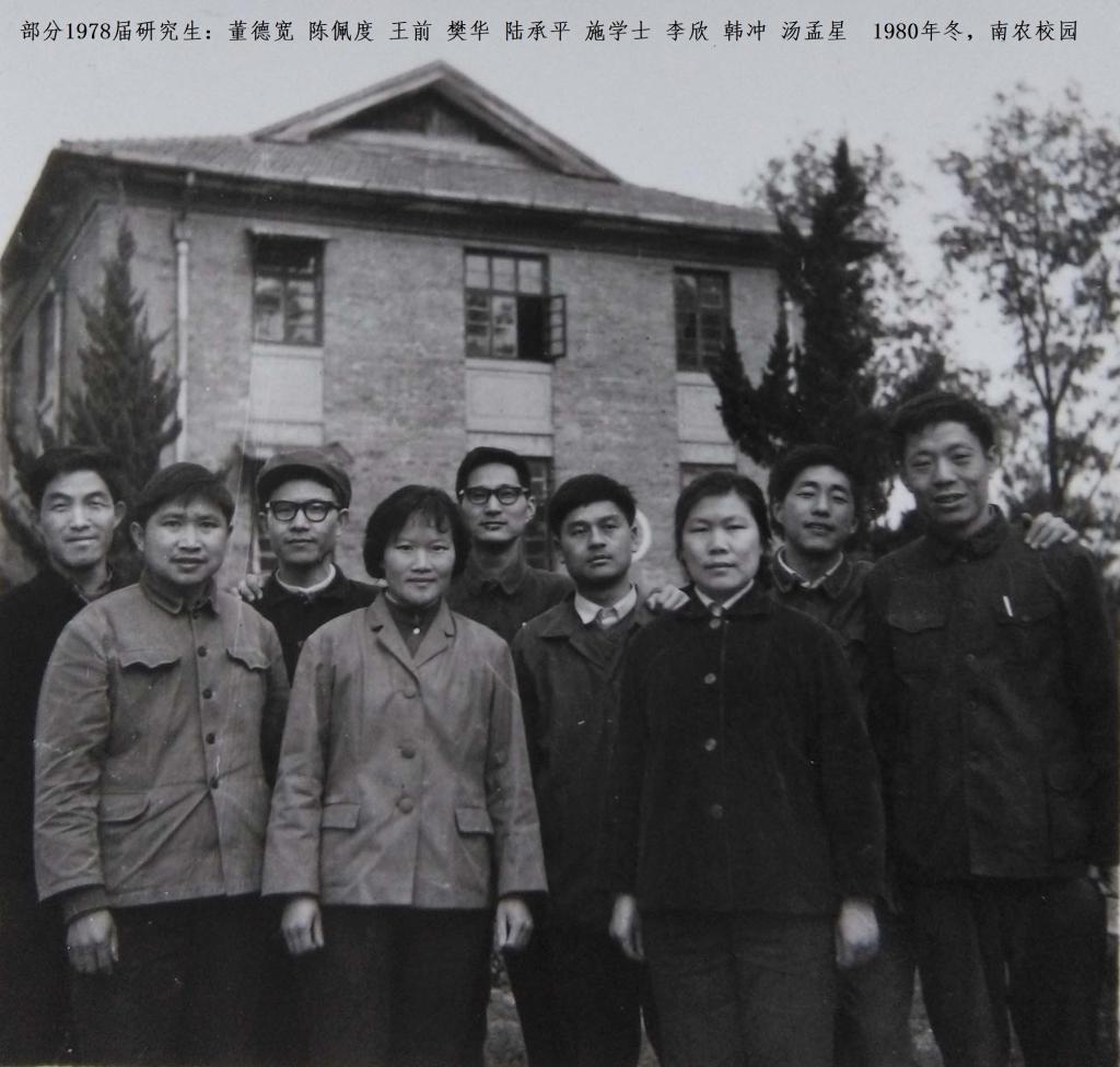 1979年新春,16名首届研究生与部分后勤人员,作为复校先遣队进驻南京卫岗,家属区的25栋刚盖好不久,尚未分给住户,成了研究生的栖身之所。不久,江苏省委党校占用的南农学生宿舍一号楼归还南农,于是由25栋迁入。我与陈溥言、韩冲、王泽霖四人住同一房间,同学们戏称“四条汉子”。复校之初,卫岗校园內卫星站、省委党校尚未撤走,偌大校园内几乎没有可用的教室,教师大多尚在扬州未回,只好去南京医学院等高校选课。好在当时南京公交方便,不堵车,记得一次从南医乘5路车,晚间人少,车开得飞快,15分钟就到卫岗。