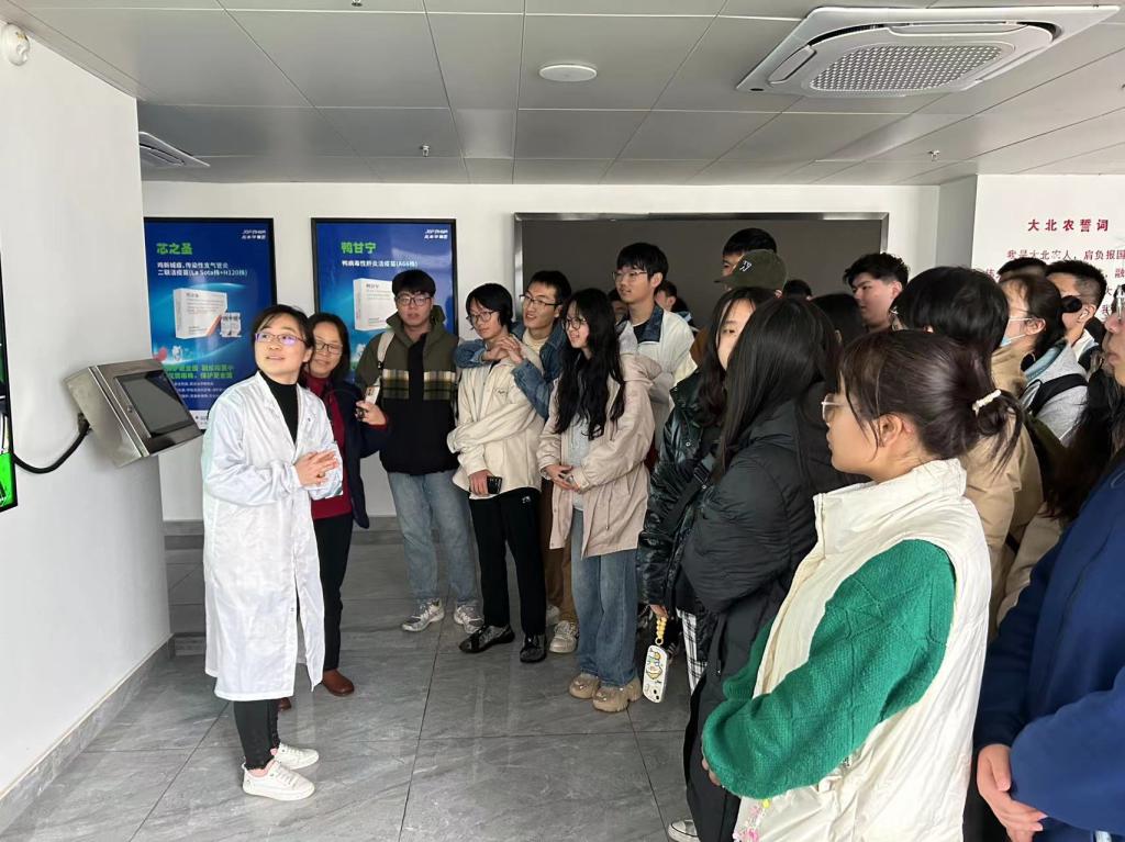 在工作人员带领下,同学们走进兆丰华南京科技园,参观学习了解活疫苗车间、灭活疫苗车间、动物房等工作内容和流程,对兽用疫苗生产、加工等环节有了直观认知。