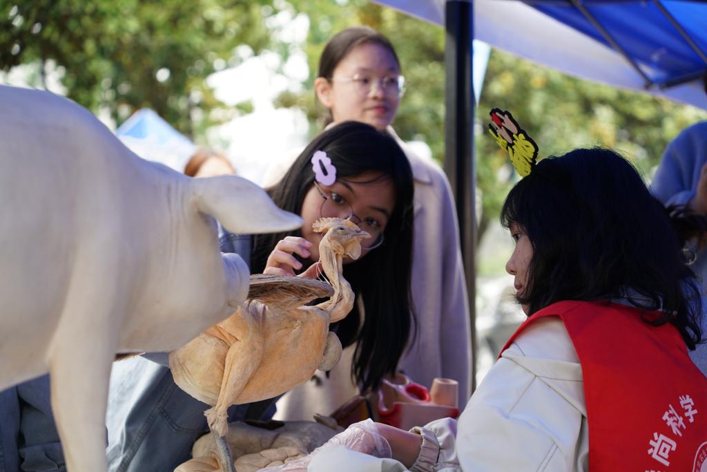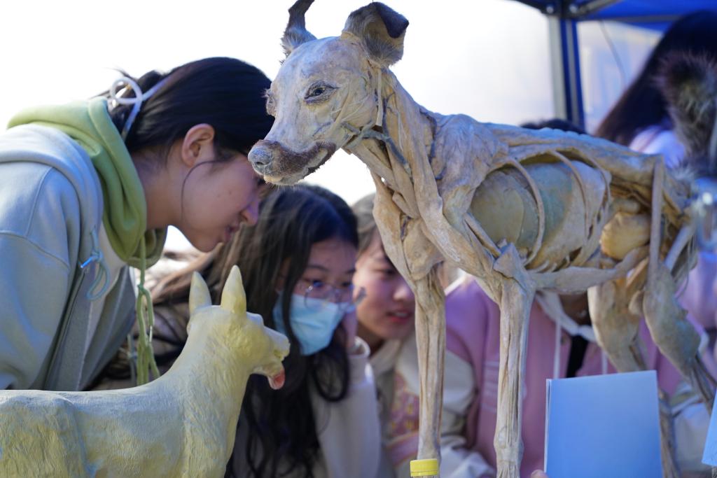 据悉,“兽医体验日”活动当日同步在户外开展,包括:食品动物标本区、伴侣动物标本区和“萌宠”体验互动区,为全校师生介绍动物医学领域相关知识,带动在校师生沉浸式、体验式、互动式了解兽医学科和感悟兽医初心使命。