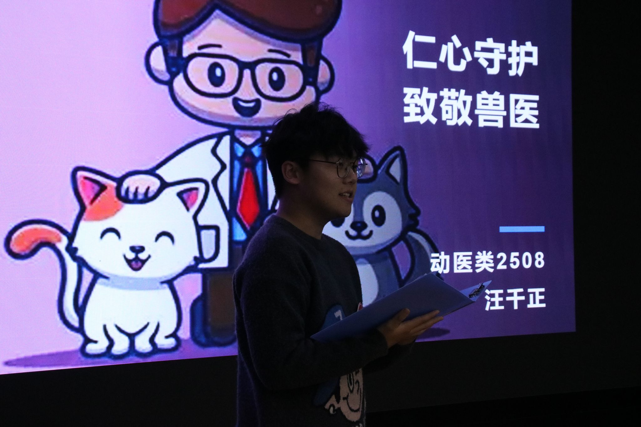 本次比赛以 “初遇兽医”“我想成为怎样的兽医”“致敬兽医精神” 三层递进主题为脉络,16 名动医学子依次登台分享。选手们或讲述与兽医职业的初遇故事,或勾勒理想兽医的职业画像,或致敬行业前辈的坚守与奉献,从田间诊疗到科研攻坚,从个体成长到行业担当,全方位诠释了兽医职业的精神内核与价值内涵。