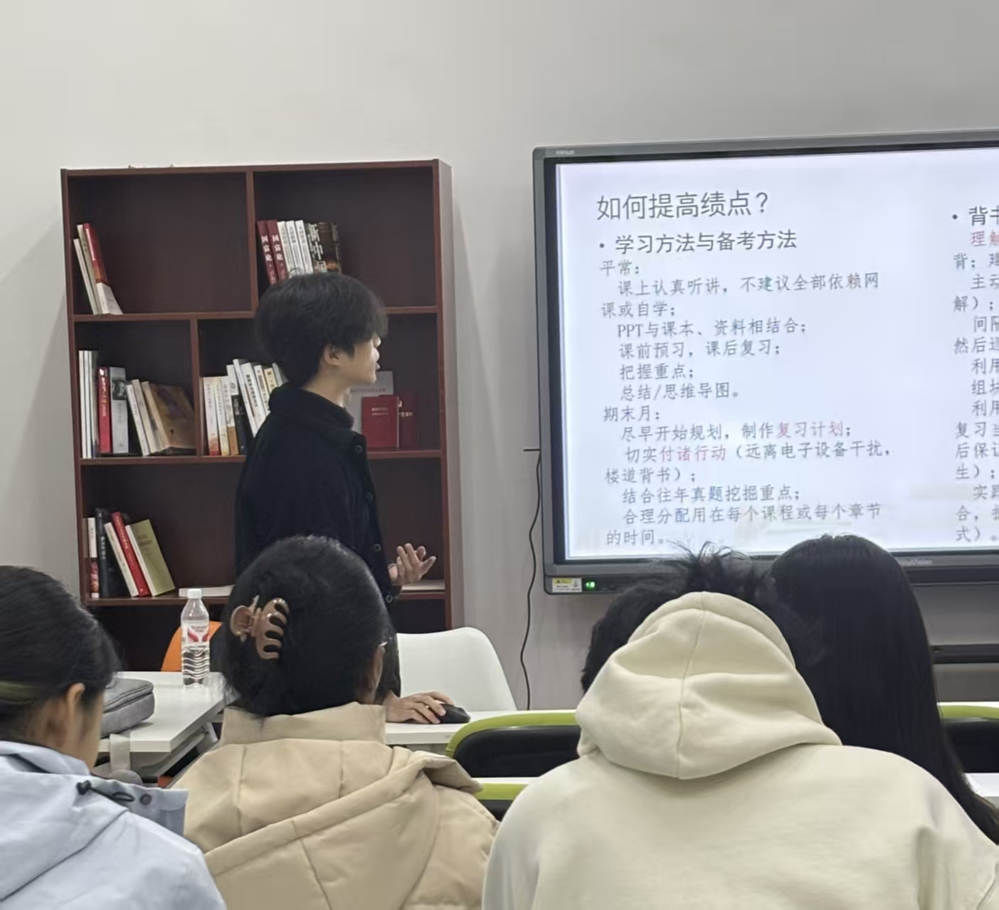 王光鹏从对“绩点”“综测”等大学名词的解释引入,解答同学们最基本的疑惑。解释了成绩结构后,他告诉同学们:“稳住大学分的同时,也要在晚课等方面付诸努力。”接着又从“学习方法与备考技巧”和“选修课规划与撰写报告”两方面,指导同学们如何学习,如何备考以及如何在复杂的选课制度下找到属于自己的节奏与惯性。最后,王光鹏以对同学们的真心祝愿为本次宣讲画上了圆满的句号。