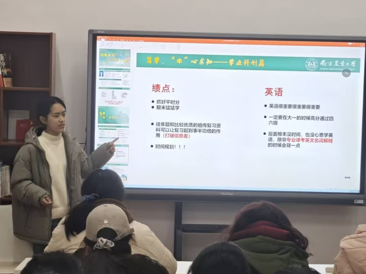 杨昱茗从“专业认知”“课业学习”以及“校园生活”三方面展开宣讲。专业认知方面,她向同学们展示了动医专业大致的职业规划,为刚刚步入专业学习的大一同学指明了方向。同时,对于学习,她主张每个人都要探索出适合自己的学习方法,并且为同学们未来的学习提供宝贵建议与经验指导。此外,杨昱茗鼓励每位同学在课余时间积极探索自我爱好,感受生活美好。接纳自我,拥抱自我,丰盈自我!