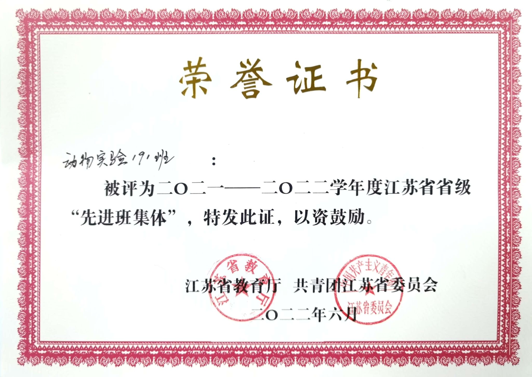 2022年动物实验191班获评2021-2022学年度江苏省省级先进班集体称号