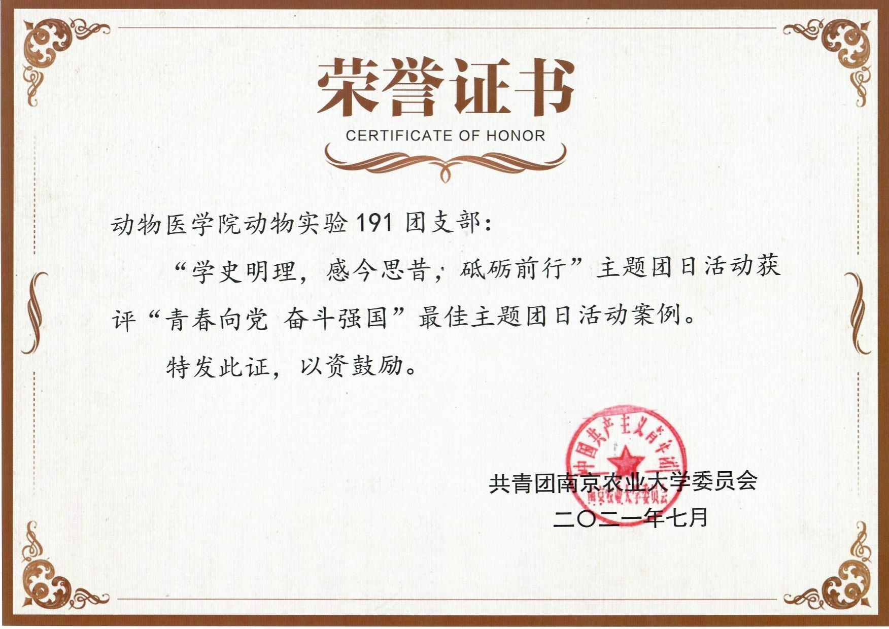 2021年动物实验191团支部获评“学史明理,感今思昔,砥砺前行”主题团日活动获评“青春向党 奋斗强国”最佳主题团日活动案例
