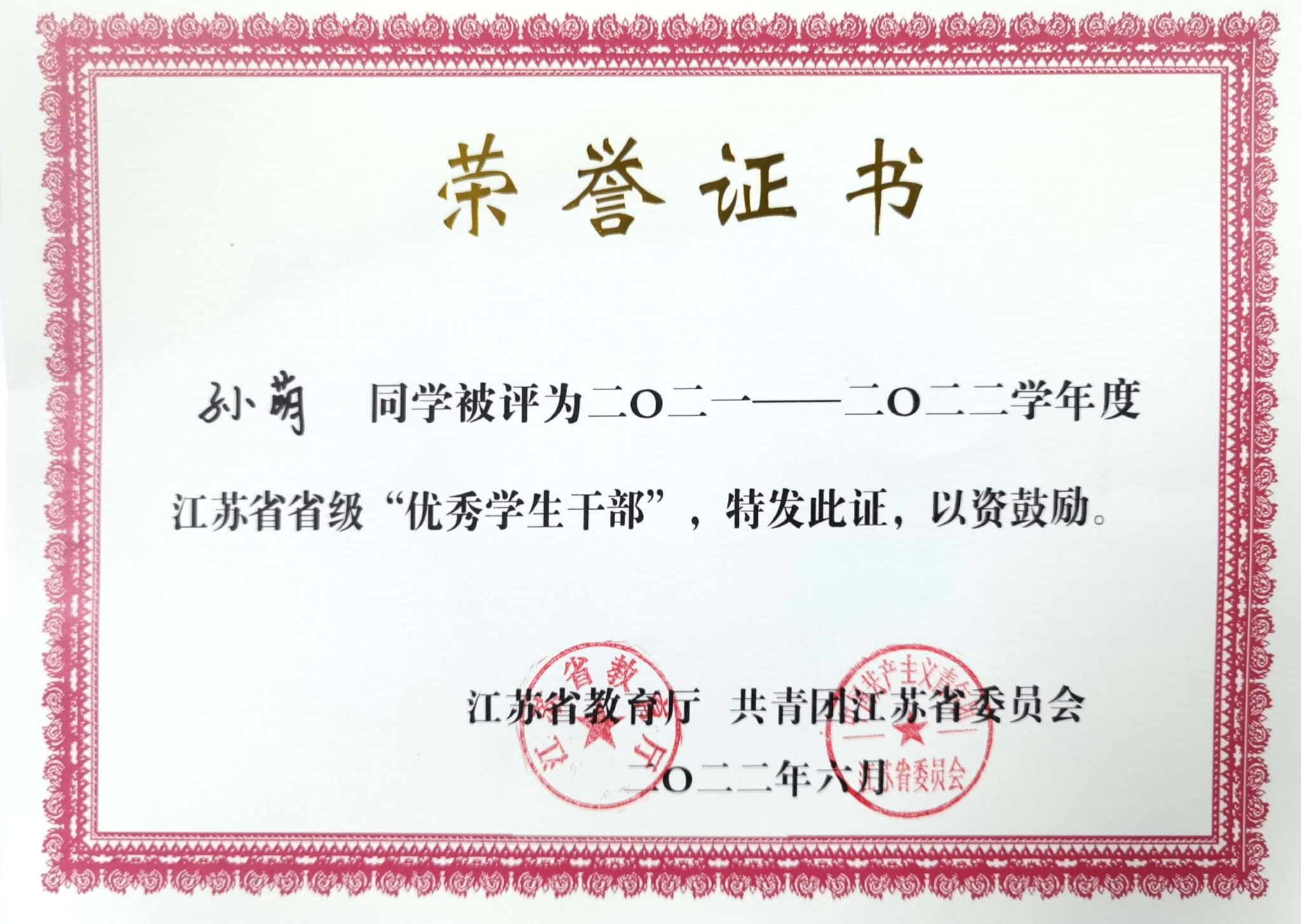 2022年孙萌获评2021-2022学年度江苏省省级优秀学生干部称号