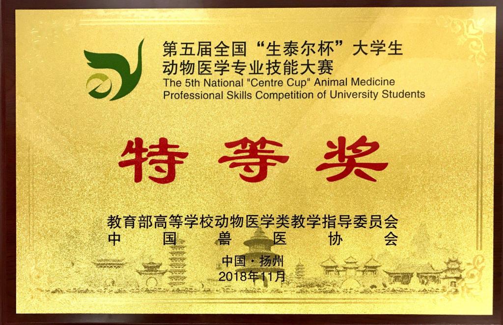 第五届全国生泰尔大学生动物医学专业技能大赛特等奖