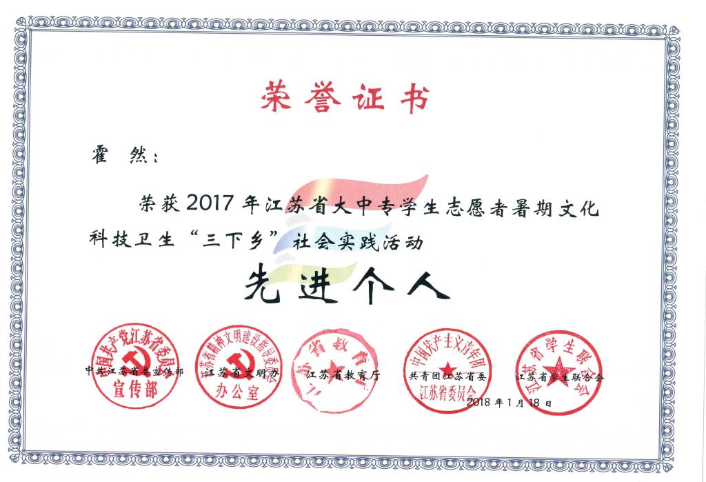 霍然获2017年省级社会实践先进个人